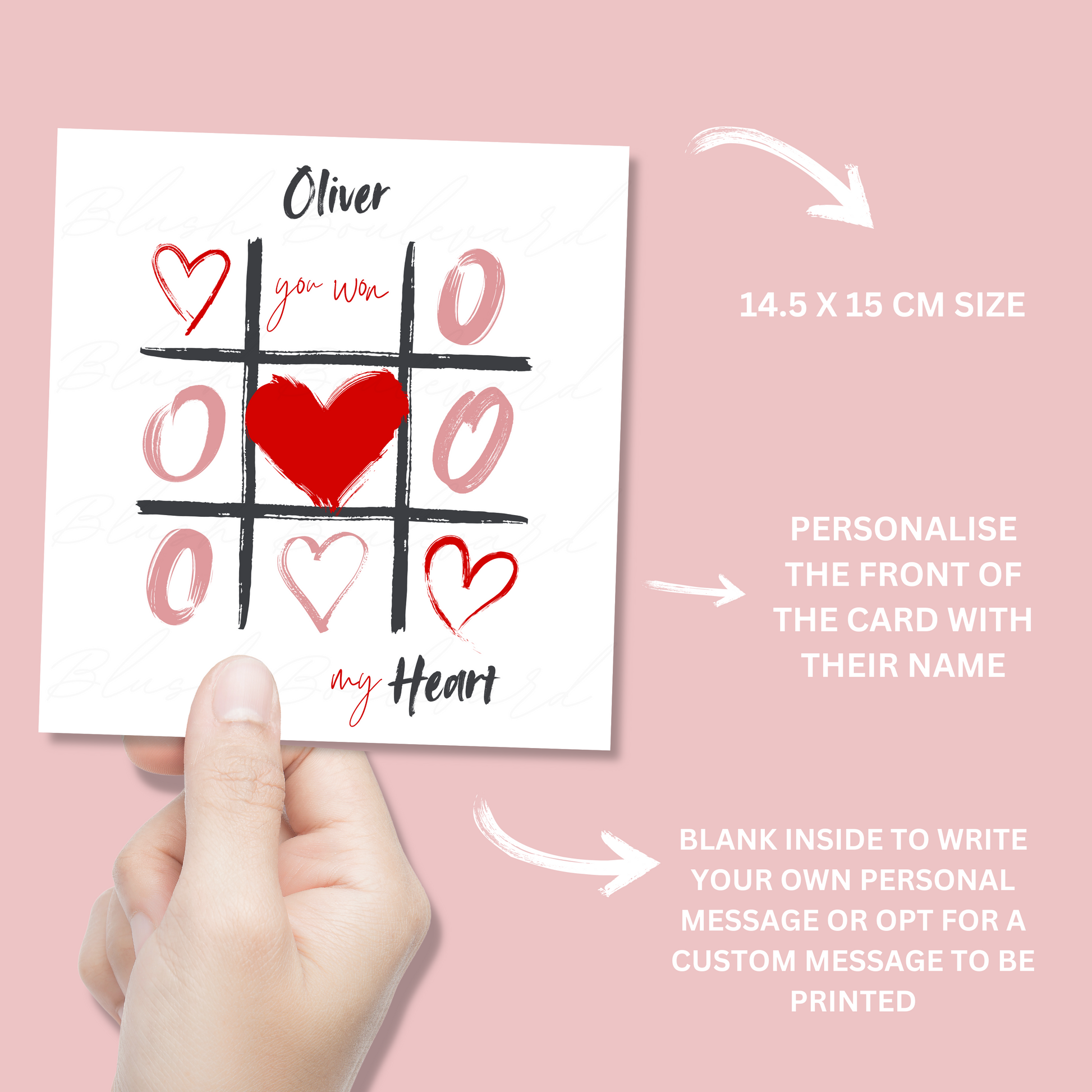 Add a personal touch to your Valentine’s Day with this fun Tic-Tac-Toe inspired card! O’s and hearts take the place of X’s, making it a sweet and playful way to say “You won my heart.” Perfect for showing someone special how much they mean to you! Include a name at the top for that extra personal flair 🤍